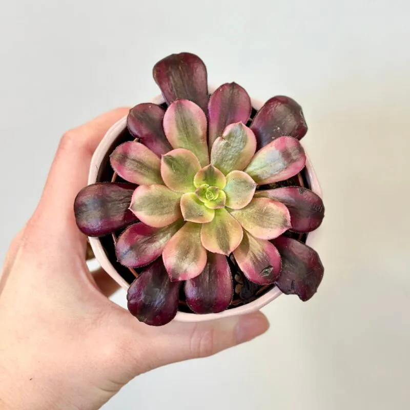 Aeonium ‘Medusa’ je výrazná sukulentná rastlina, ktorá zaujme svojimi veľkými ružicami listov s výrazným panašovaním. Listy majú kombináciu zelenej, krémovej a jemne ružovej farby, pričom okraje bývajú sfarbené do červenkastých až medených tónov. Práve toto farebné prechádzanie medzi odtieňmi jej dodáva jedinečný dekoratívny vzhľad.