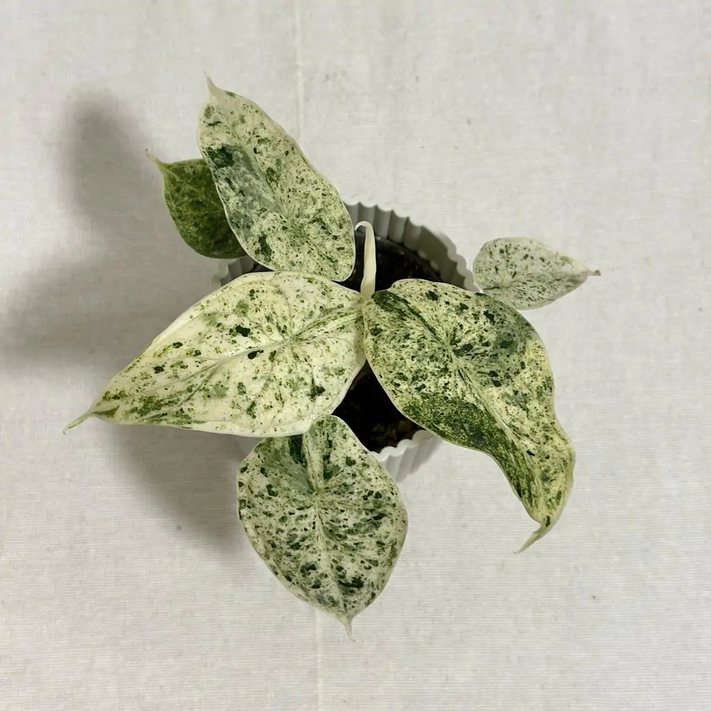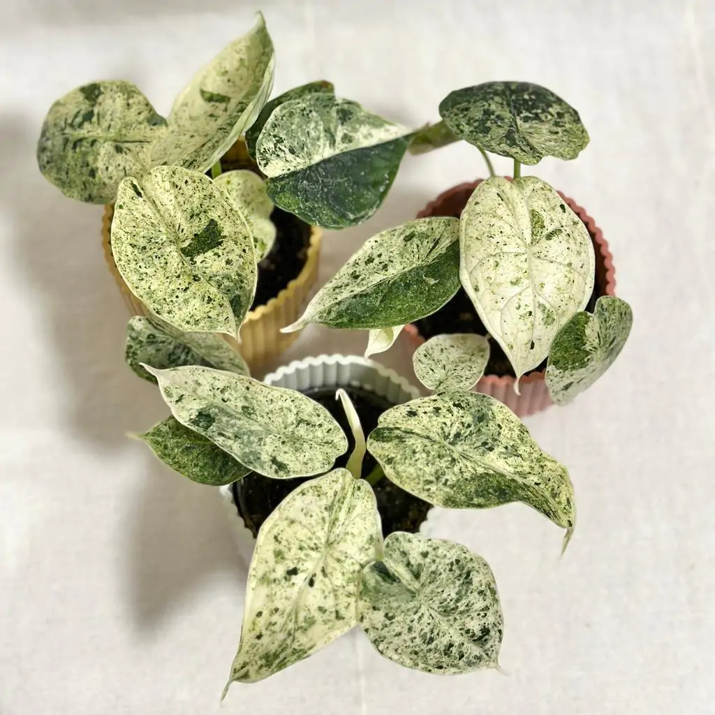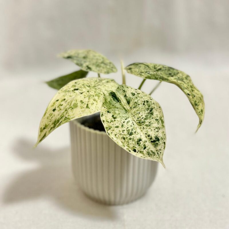Vzácna Alocasia ‘Dragon Scale Mint Variegata’ je jedným z najžiadanejších kúskov medzi zberateľmi rastlín. Jej listy zdobia zelené odtiene s výrazným panašovaním v bielych a svetlozelených tónoch. Štruktúra listov vytvára dojem, akoby boli dračími šupinami – podľa toho získala astlina aj svoj názov. Každý list panašovanej rastliny je vždy unikátny – ako umelecké dielo samotnej prírody.