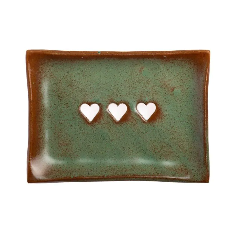 Keramická mydelnička na nožičkách so zaujímavou zelenou glazúrou a troma srdiečkami je ručne vyrobená na Slovensku v dielni Keramika Greško. Je modelovaná, ručne maľovaná a glazovaná. Keďže sa jedná o ručnú prácu každá mydelnička sa môže mierne líšiť od tej na ilustračnej fotografii.